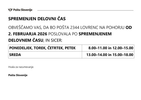 OBVESTILO - SPREMENJEN DELOVNI ČAS POŠTE27.01.2026Obveščamo vas, da bo pošta 2344 Lovrenc na Pohorju od 2. februarja 2026 poslovala po spremenjenem delovnem času, in sicer: PONEDELJEK, TOREK, ČETRTEK, PETEK: 8.00–11.00 in 12.00–15.00 SREDA: 13.00–14.00 in 15.00–18.00 Hvala za razumevanje. Pošta Slovenije -