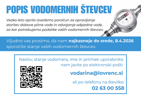 POPIS VODOMERNIH ŠTEVCEV25.03.2026Vsako leto aprila izvedemo poračun za opravljanje storitev dobave pitne vode in odvajanje odpadne vode, za kar potrebujemo podatke vaših vodomernih števcev. Vljudno vas prosimo, da nam najkasneje do srede, 8. 4. 2026 sporočite stanje vaših vodomernih števcev. Naslov, stanje vodomera, ime in priimek uporabnika nam javite po elektronski pošti: vodarina@lovrenc.si ali po telefonu na številko: 02 63 00 558 -