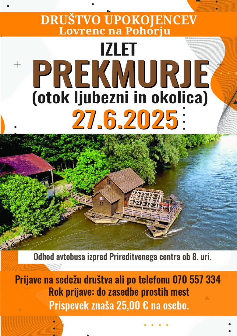 Društvo upokojencev Lovrenc na Pohorju vabi na izlet v PREKMURJE, ki bo 27.6.2025. Odhod avtobusa izpred Prireditvenega centra ob 8. uri.