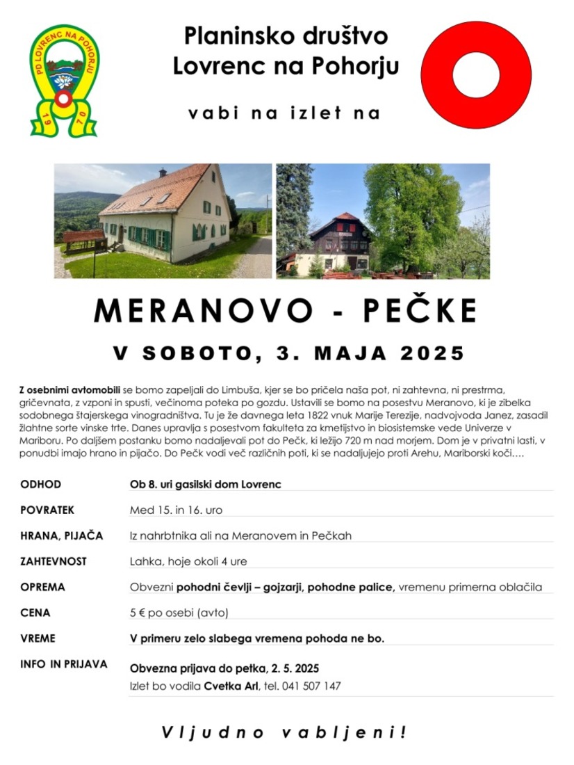 V soboto, 3. maja, vabi Planinsko društvo Lovrenc na planinski izlet na Meranovo in Pečke