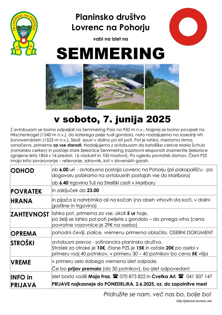 Planinsko društvo Lovrenc vabi v soboto, 7. junija, na planinski izlet na avstrijski prelaz Semmering.