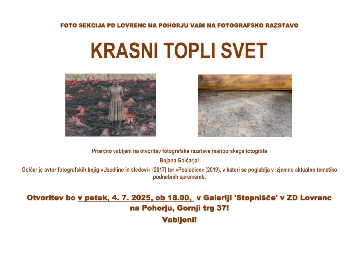 Fotosekcija Planinskega društva Lovrenc vabi v petek, 4. julija, ob 18. uri v galerijo "Stopnišče" v Zdravstveni dom na otvoritev fotografske razstave Bojana Golčarja z naslovom "Krasni topli svet".