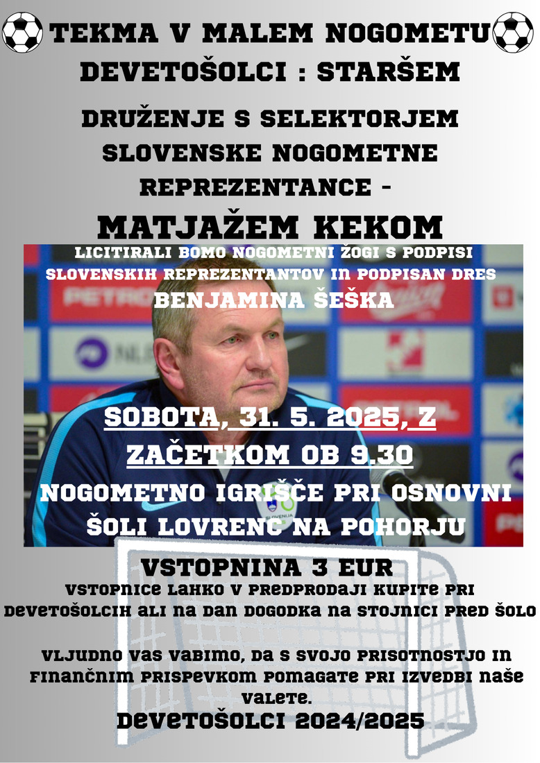 V soboto, 31. 5. 2025, vas ob 9.30 vabimo na nogometno obarvan dopoldan. Družili se bomo s selektorjem slovenske reprezentance v nogometu, Matjažem Kekom, odigrali tekmo z našimi starši in licitirali dve žogi s podpisi slovenski reprezentantov ter podpisan dres Benjamina Šeška. Vstopnice (3 eur) za prireditev lahko v predprodaji kupite pri devetošolcih oz. na dan dogodka na stojnici pred vhodom v šolo.