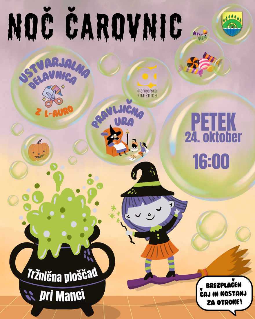Vabimo vas, da se nam pridružite v petek, 24. oktobra 2025, ob 16. uri na Tržnični ploščadi pri Manci, kjer bomo skupaj preživeli pravljično in ustvarjalno popoldne ob prihajajoči Noči čarovnic. ✨