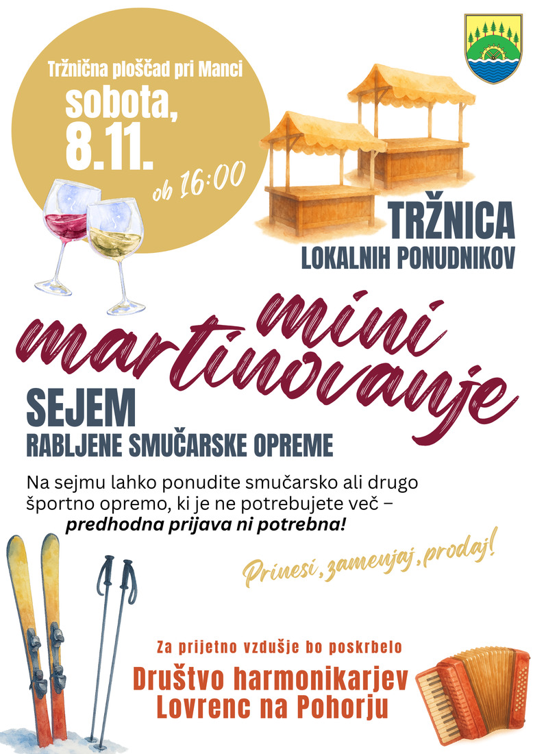 Vabljeni, da se nam pridružite na mini martinovanju s tržnico lokalnih ponudnikov in sejmom rabljene smučarske opreme, ki bo potekalo v soboto, 8. novembra 2025, ob 16. uri na tržnični ploščadi pred Manco.