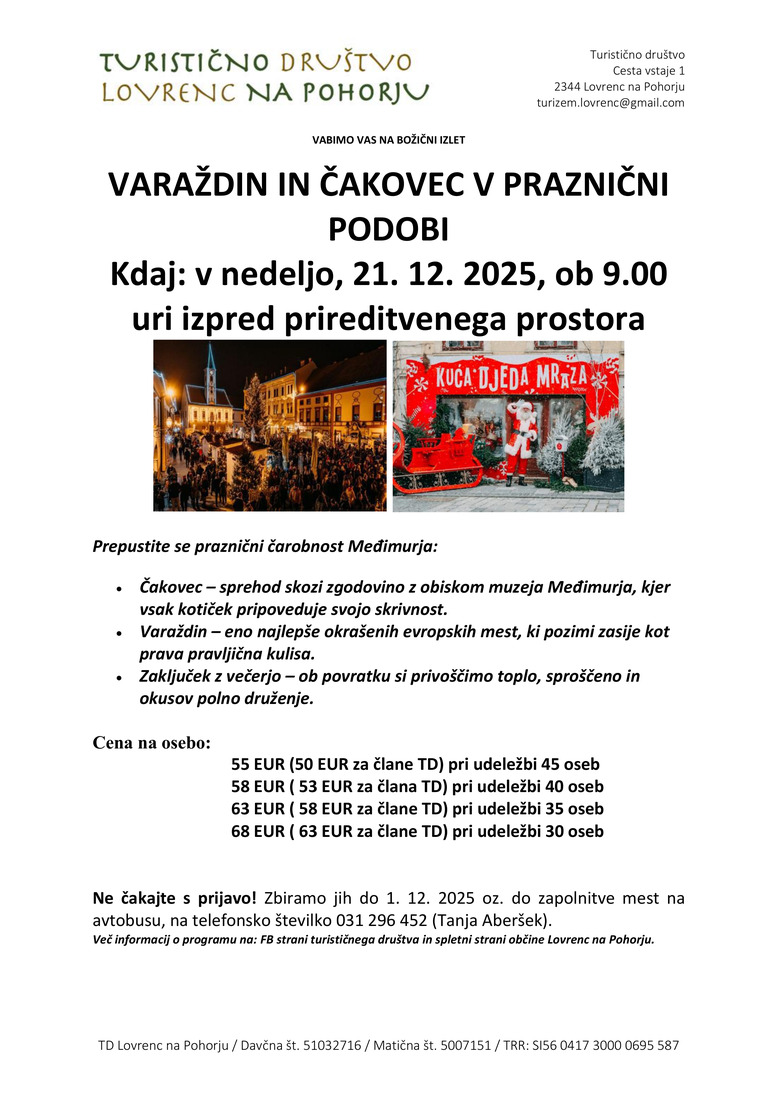 Zbiramo jih do 1. 12. 2025 oz. do zapolnitve mest na avtobusu, na telefonsko številko 031 296 452 (Tanja Aberšek).