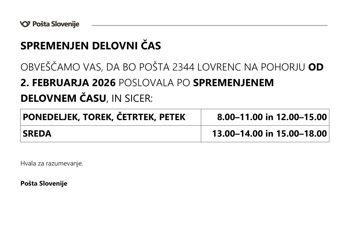 OBVESTILO - SPREMENJEN DELOVNI ČAS POŠTE