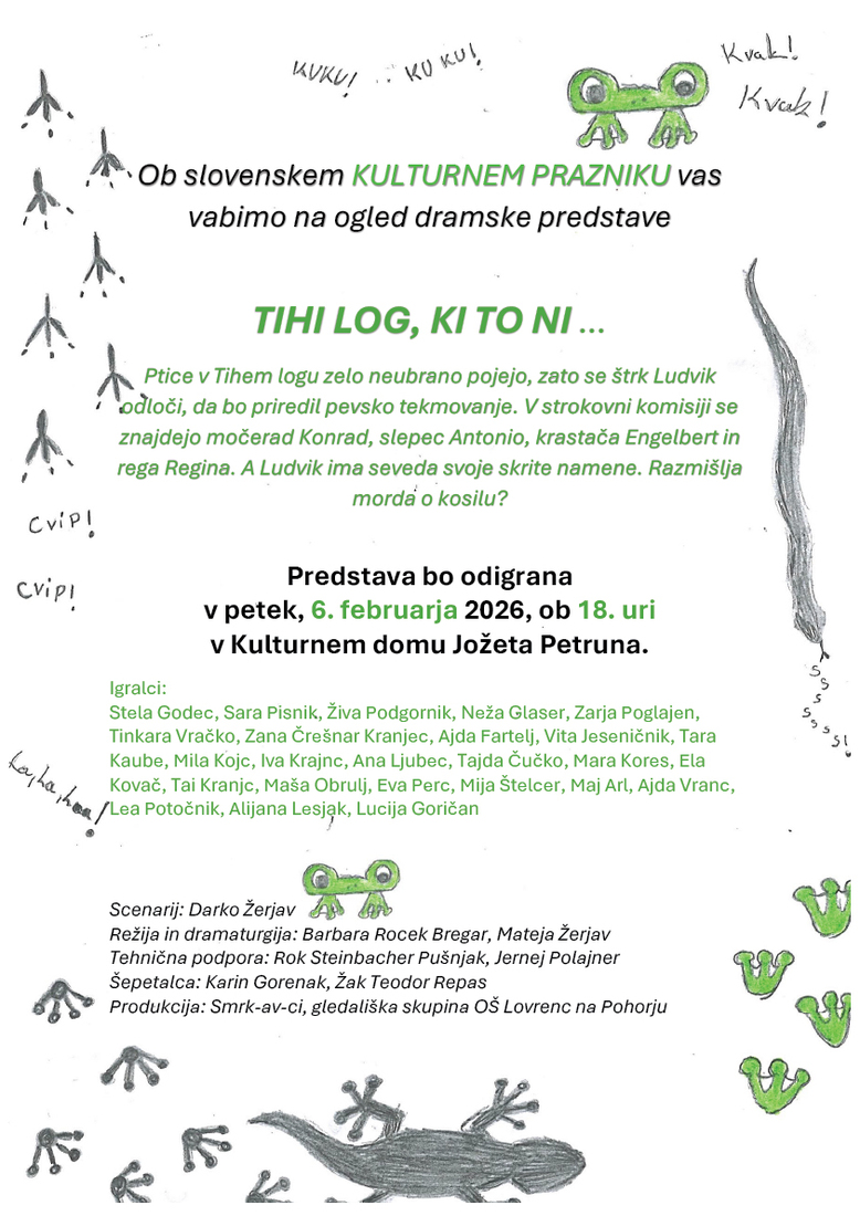 Ob slovenskem kulturnem prazniku vas učenci gledališke skupine Smrk‑av‑ci OŠ Lovrenc na Pohorju prijazno vabijo na ogled dramske predstave Tihi log, ki to ni.