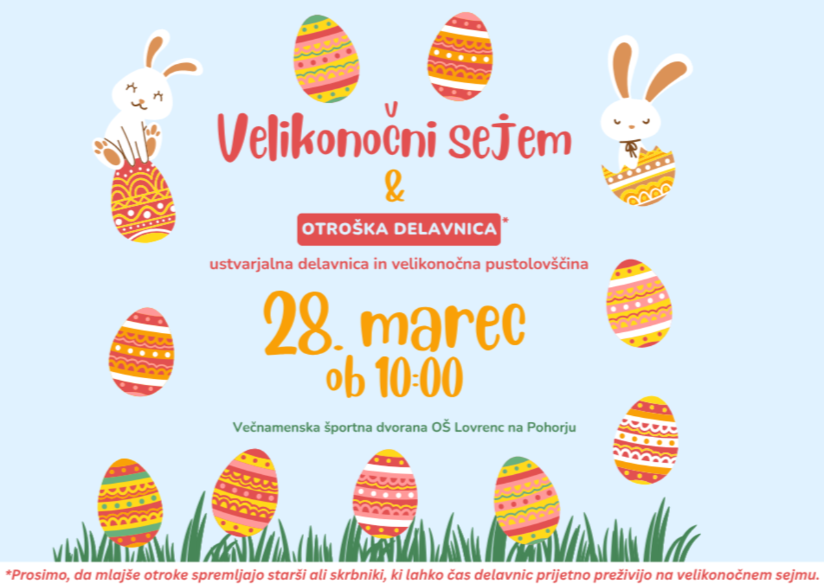 Vabljeni, da se nam pridružite na velikončnem sejmu in otroški delavnici, ki bosta potekala v soboto, 28. marca 2026, ob 10.00 uri. Dogodek bo potekal v Večnamenski športni dvorani v Osnovni šoli Lovrec na Pohorju.