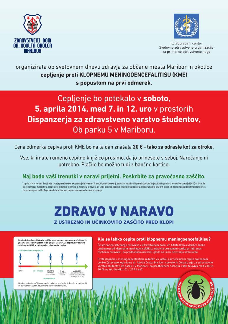 Zdravstveni dom Maribor organizira ob svetovnem dnevu zdravja za občane mesta Maribor in okolice cepljenje proti KLOPNEMU MENINGOENCEFALITISU (KME) s popustom na prvi odmerek.