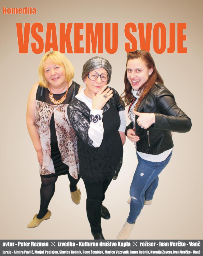 Komedijo v izvedbi gledališke skupine Kulturnega društva Kapla vam ob dnevu žena podarja Občina Lovrenc.