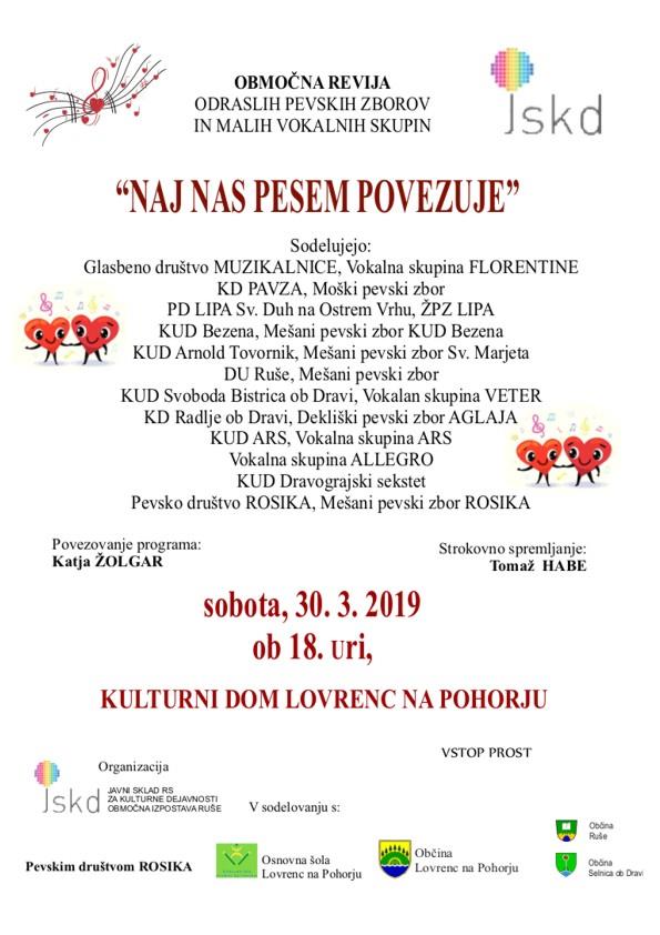 Na reviji pevskih zborov in vokalnih skupin pod naslovom "Naj nas pesem povezuje" bo zapelo sedem zborovskih zasedb in pet vokalnih skupin. Vsaka skupina bo zapela tri pesmi. Skupine prihajajo iz izpostave JSKD Ruše - osem skupin, JSKD Maribor - ena skupina, JSKD Radlje ob Dravi - ena skupina in JSKD Dravograd - ena skupina.