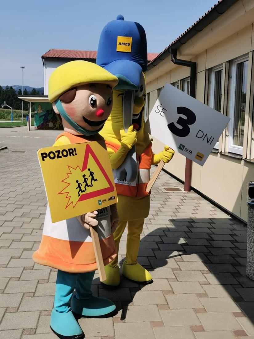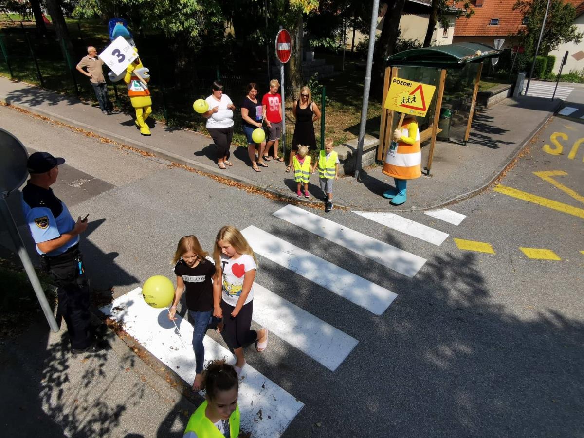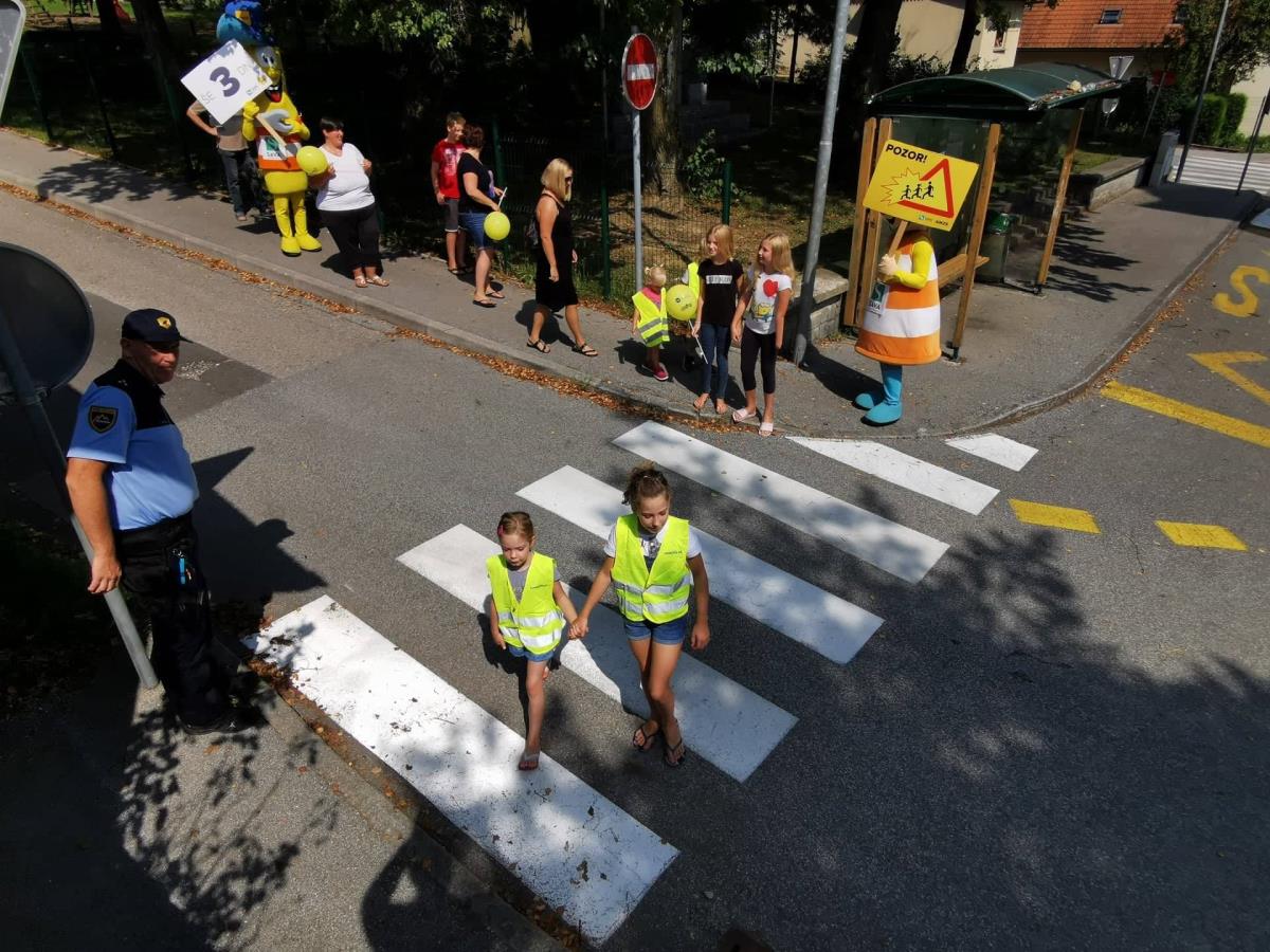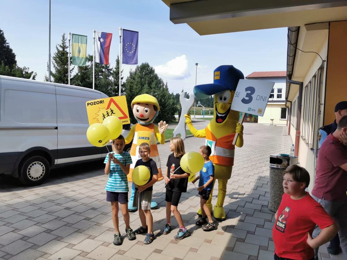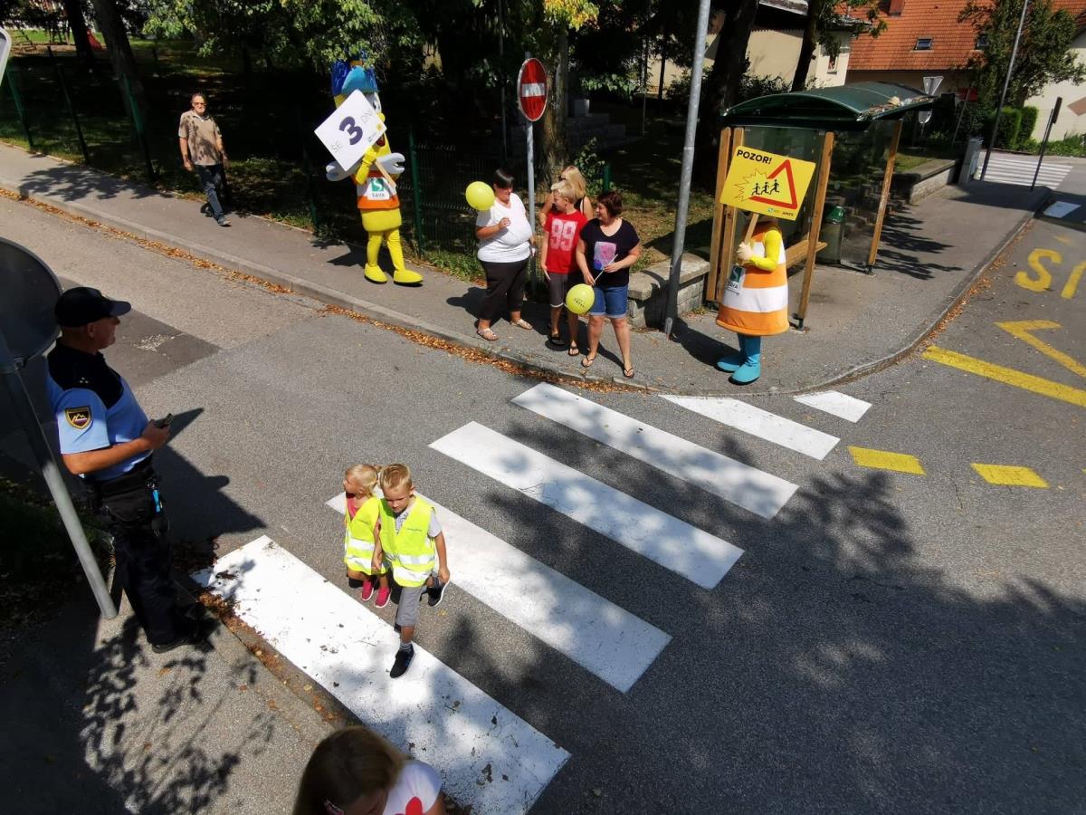 Maskoti AMZS Anja in Zdravko ter policist Franc Osvald so učili otroke varnega in pravilnega prečkanja ceste na prehodu za pešce, voznike pa smo skupaj opozarjali na strpno in previdno vožnjo v okolici šole in vrtca na prvi šolski dan in tako vseh 365 dni v letu.