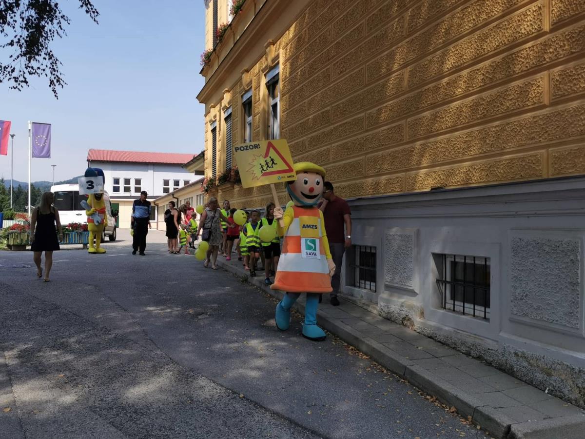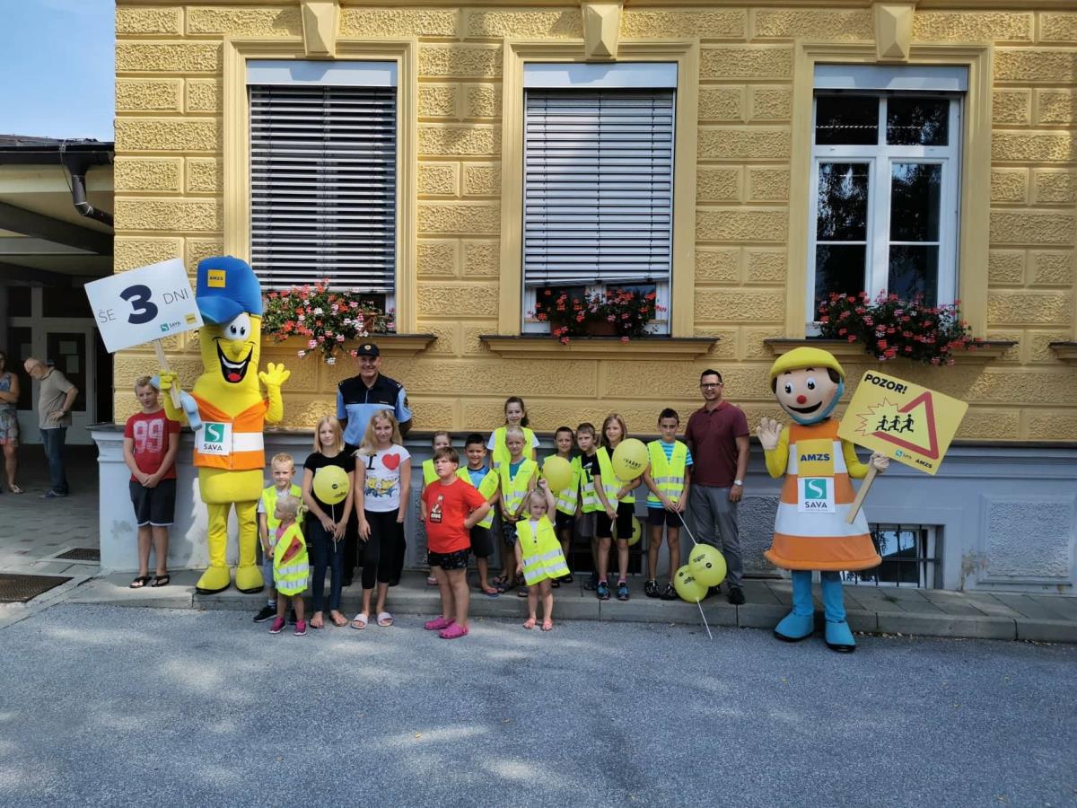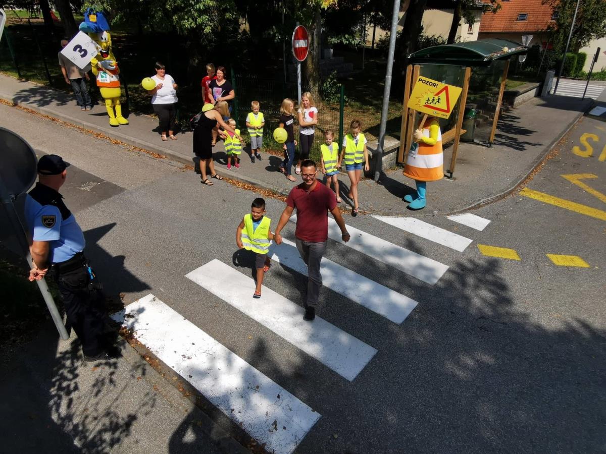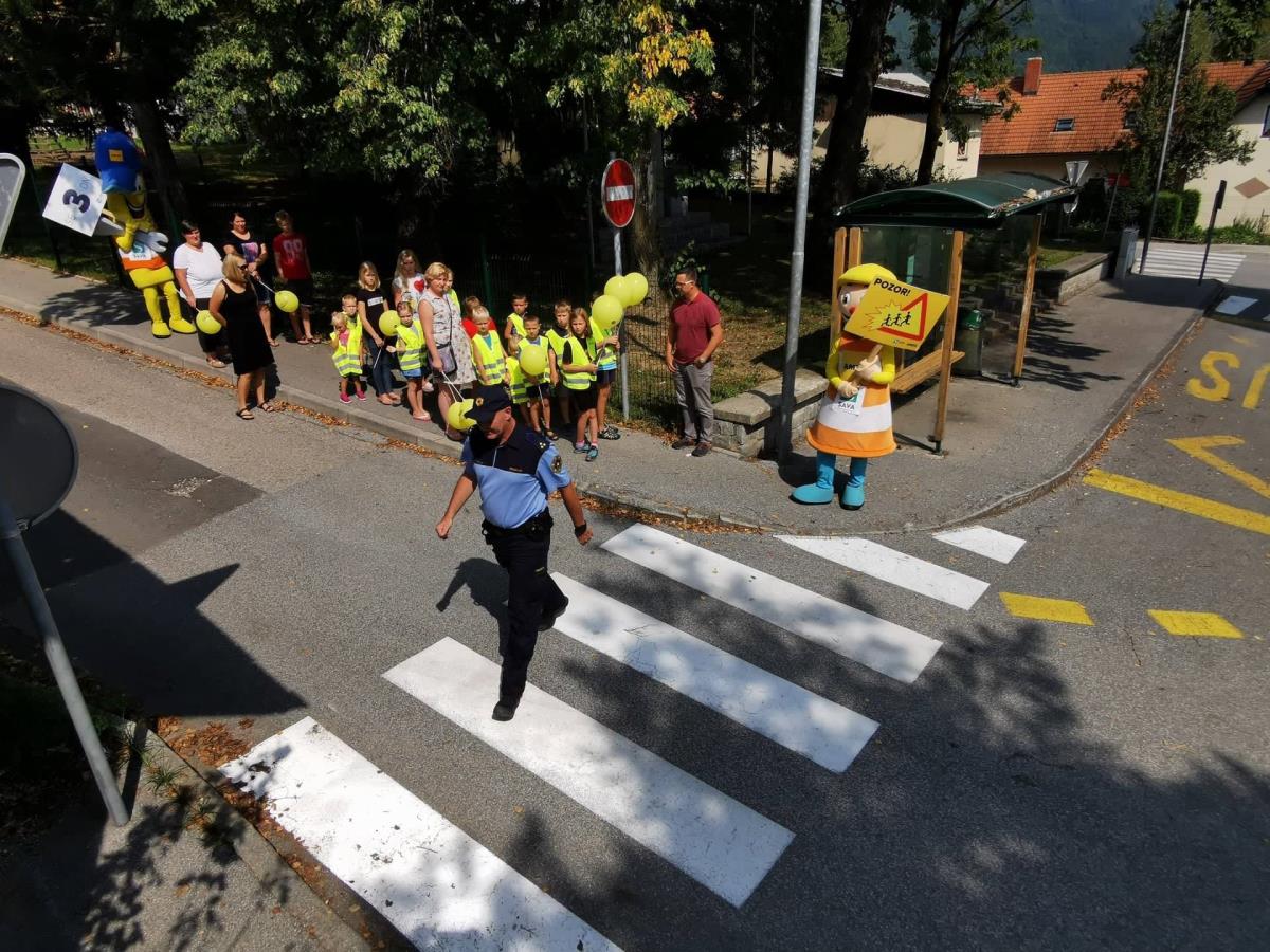 Maskoti AMZS Anja in Zdravko ter policist Franc Osvald so učili otroke varnega in pravilnega prečkanja ceste na prehodu za pešce, voznike pa smo skupaj opozarjali na strpno in previdno vožnjo v okolici šole in vrtca na prvi šolski dan in tako vseh 365 dni v letu.