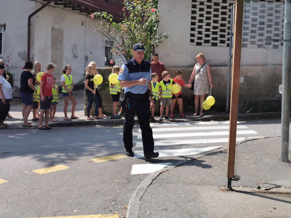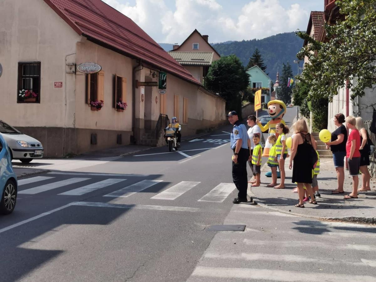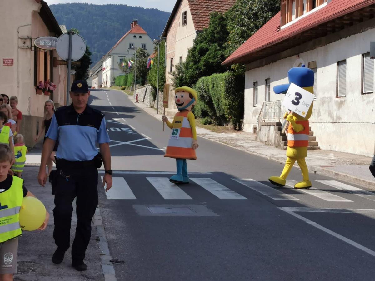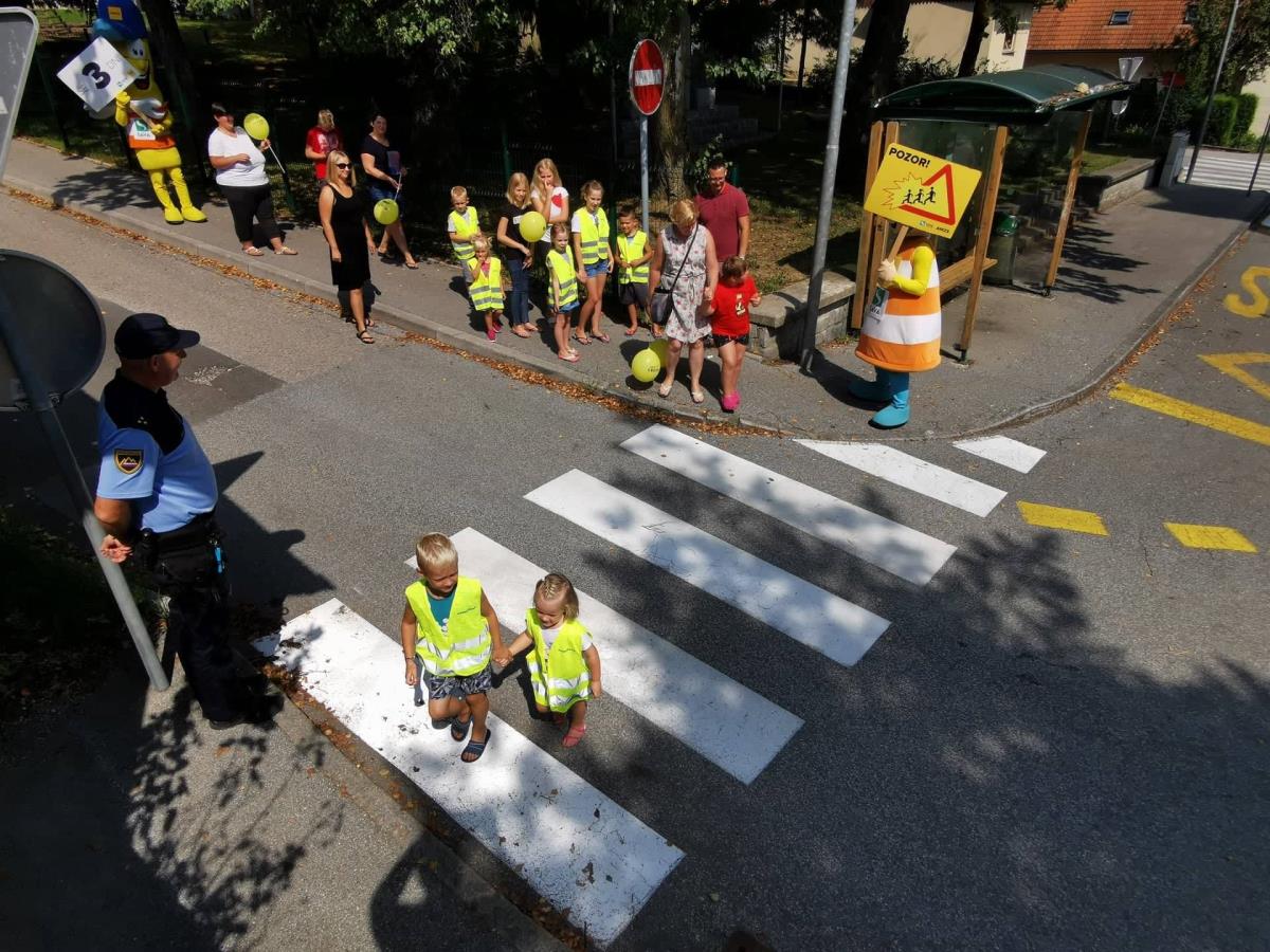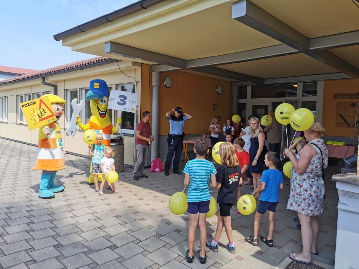 Maskoti AMZS Anja in Zdravko ter policist Franc Osvald so učili otroke varnega in pravilnega prečkanja ceste na prehodu za pešce, voznike pa smo skupaj opozarjali na strpno in previdno vožnjo v okolici šole in vrtca na prvi šolski dan in tako vseh 365 dni v letu.