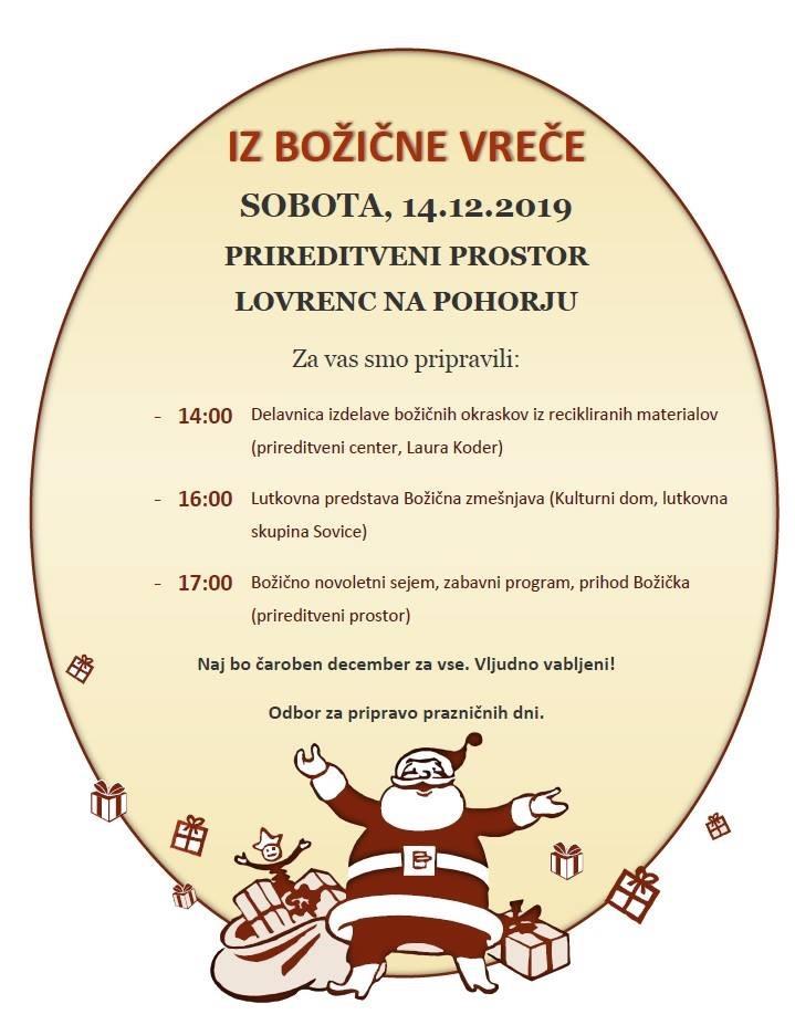 V soboto 14.12.2019 ste vljudno vabljeni na prireditveni prostor Lovrenc na Pohorju, kjer smo za vas pripravili: