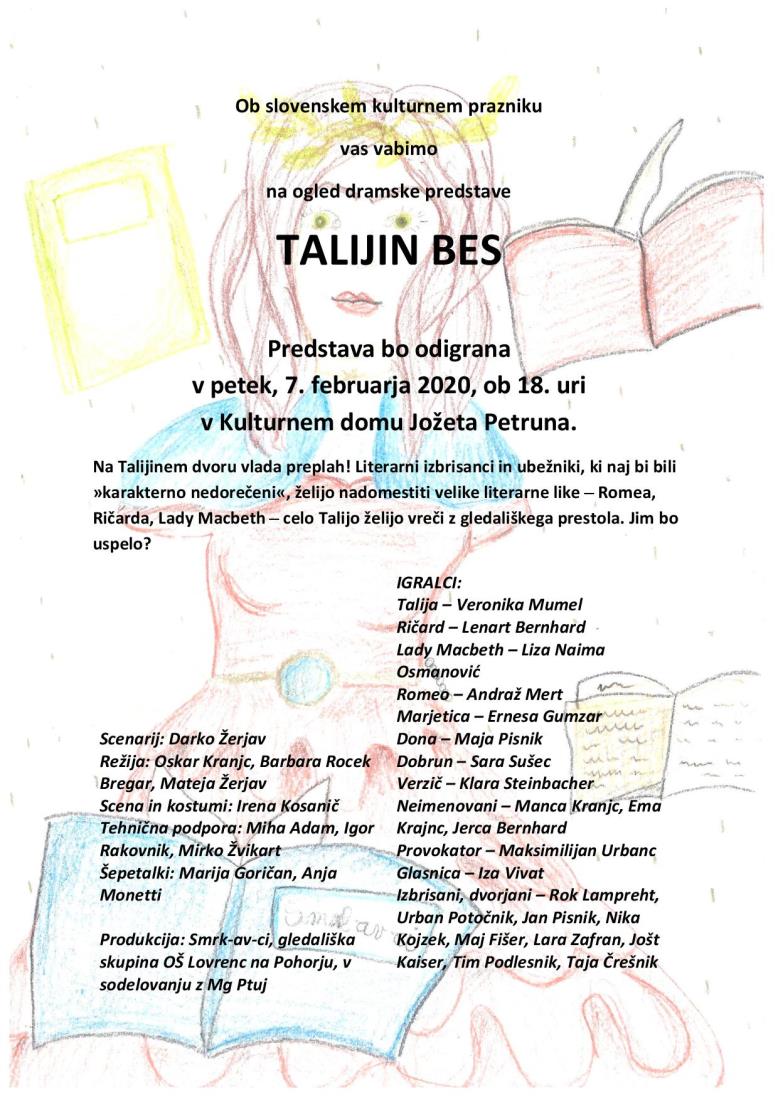 Ob slovenskem kulturnem prazniku vas vabimo na ogled dramske predstave: TALIJIN BES