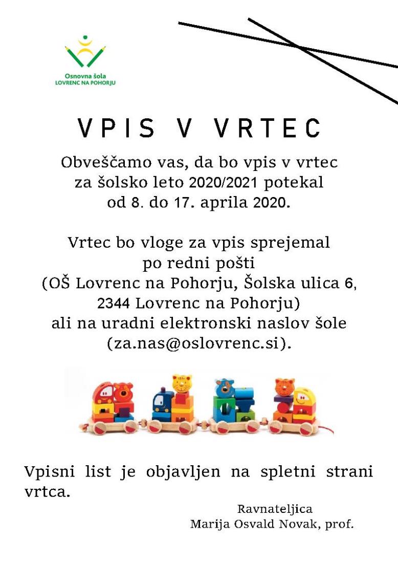 Vrtec bo vloge za vpis sprejemal po redni pošti (OŠ Lovrenc na Pohorju, Šolska ulica 6, 2344 Lovrenc na Pohorju)