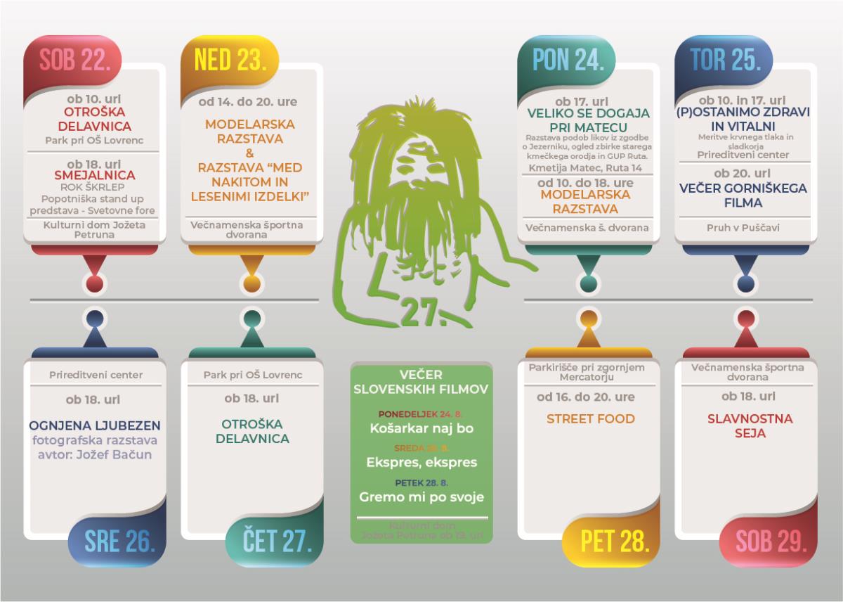 Predstavljamo vam program letošnjih, že 27. Jezernikovih dni. Ta bo drugačen, kot smo ga vajeni, skrajšan in okrnjen. Organizatorji prireditev smo se kljub negotovostim, s katerimi smo se srečevali, in omejitvam, ki jih je potrebno upoštevati, potrudili, da bo pester, zanimiv, predvsem pa varen in da bo vsem ostal v lepem spominu.