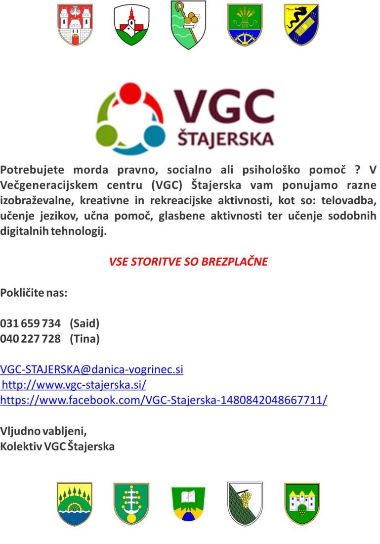 Potrebujete morda pravno, socialno ali psihološko pomoč ? V Večgeneracijskem centru (VGC) Štajerska vam ponujajo razne izobraževalne, kreativne in rekreacijske aktivnosti, kot so: telovadba, učenje jezikov, učna pomoč, glasbene aktivnosti ter učenje sodobnih digitalnih tehnologij.