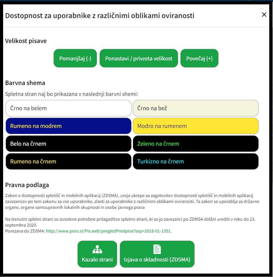 - omogočeno je izbiranje velikosti pisave in izbiranje barvne sheme glede na barvno slepoto obiskovalca spletne strani,