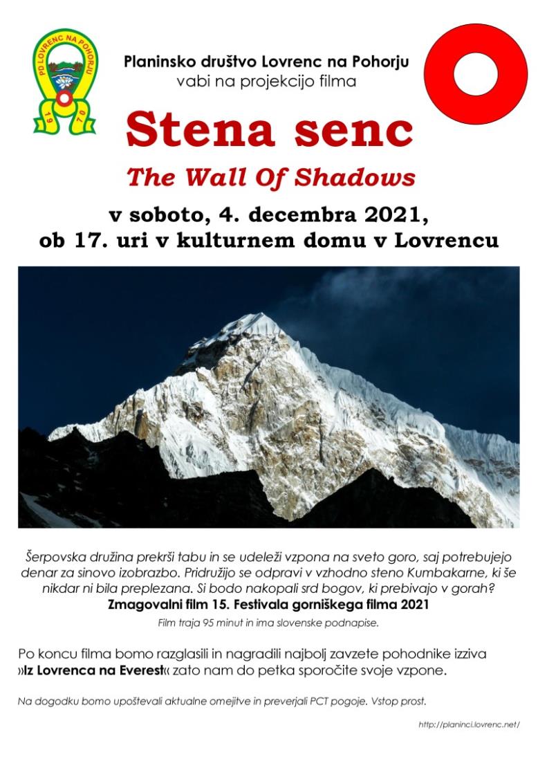 Planinsko društvo Lovrenc na Pohorju vabi na projekcijo filma Stena senc (The Wall Of Shadows) v soboto, 4. decembra 2021, ob 17. uri v kulturnem domu v Lovrencu.