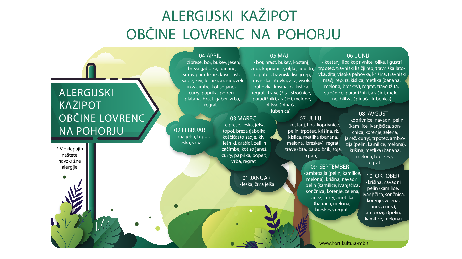 ALERGIJSKI KAŽIPOT OBČINE LOVRENC NA POHORJU na pregleden način izpostavlja najpogostejše povzročitelje senenega nahoda oziroma alergijskega rinitisa ter navzkrižne alergije.