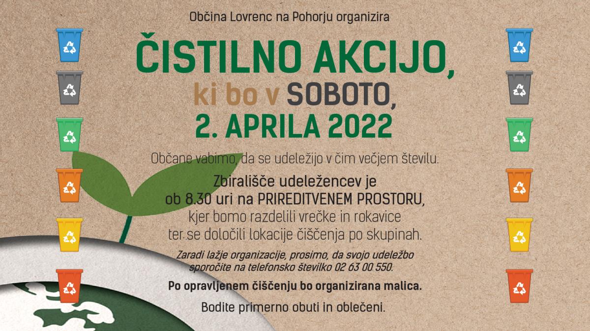 Zaradi jutrišnje slabe vremenske napovedi, je čistilna akcija prestavljena na nedeljo, 3.4.2022, z zborom ob 8.30 uri na Prireditvenem prostoru, kjer se bodo razdelile vrečke in rokavice.