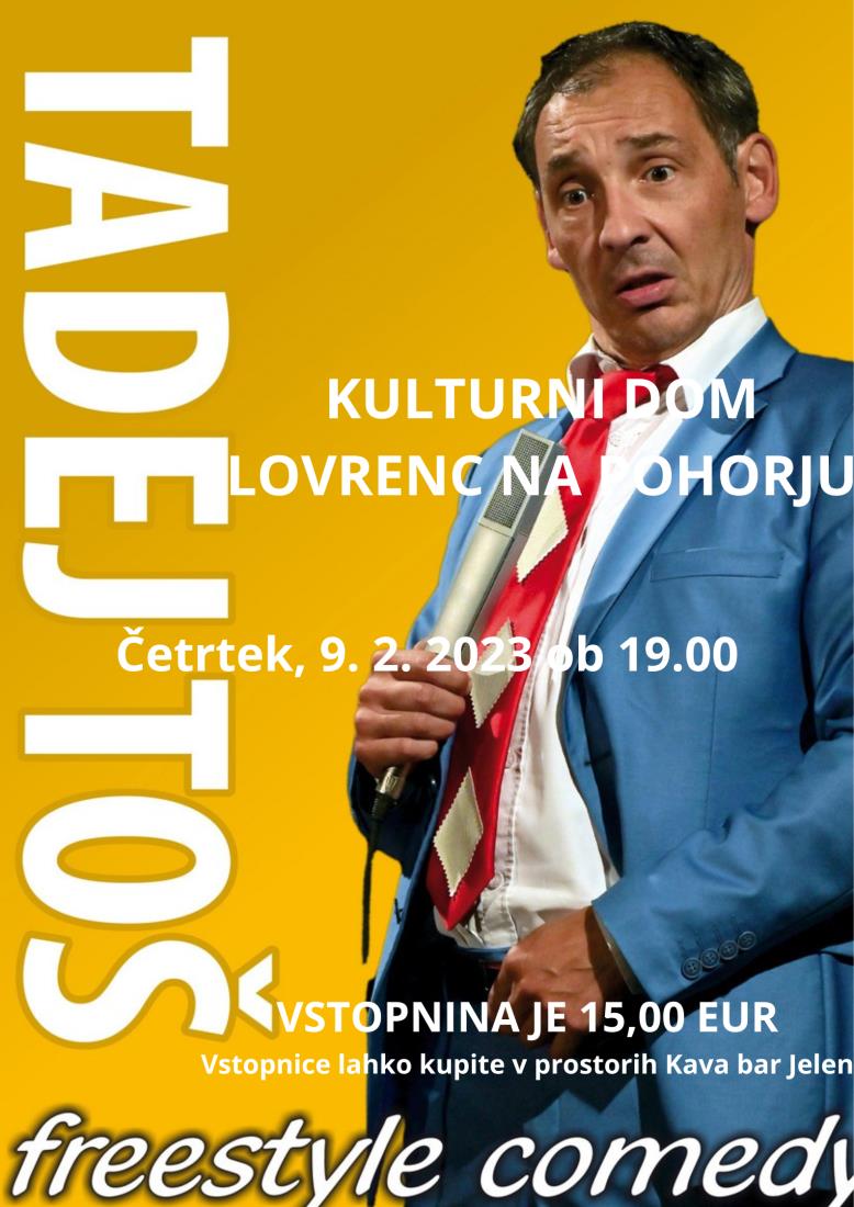 Vabimo vas, da se udeležite STAND UP predstave TADEJA TOŠA, ki bo v četrtek, 9. 2. 2023 z začetkom ob 19.00, v Kulturnem domu Jožeta Petruna Lovrenc na Pohorju.