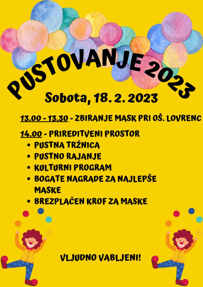 V soboto, 18. 2. 2023 vas vabimo, da se udeležite pustnega rajanja. Pustovanje se prične ob 13.00 z zbiranjem mask pred O.Š. Lovrenc na Pohorju in nadaljuje na Prireditvenem prostoru z zabavnim programom in tržnico lokalnih ponudnikov. Vsaka maska prejme brezplačen krof in topel napitek. Najlepše maske čakajo lepe nagrade!