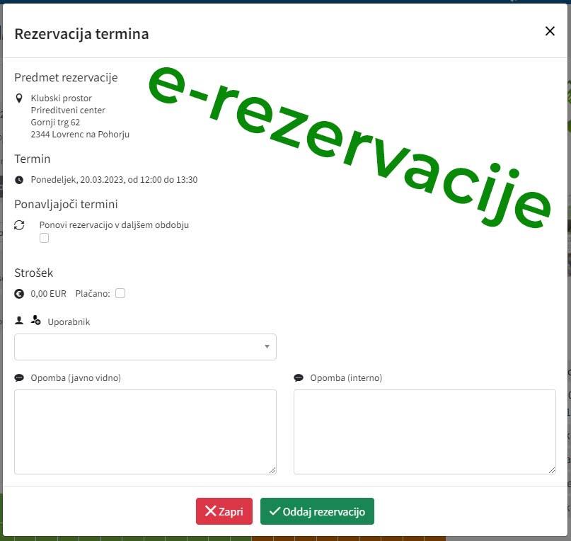 Aktiviran je nov zavihek e-rezervacije, ki vam omogoča spletno rezervacijo prostorov. Sedaj lahko na spletni strani preverite razpoložljivost termina in opravite rezervacijo prostora. Za oddajo rezervacije je potrebna prijava oz. registracija na spletni strani lovrenc.si.
