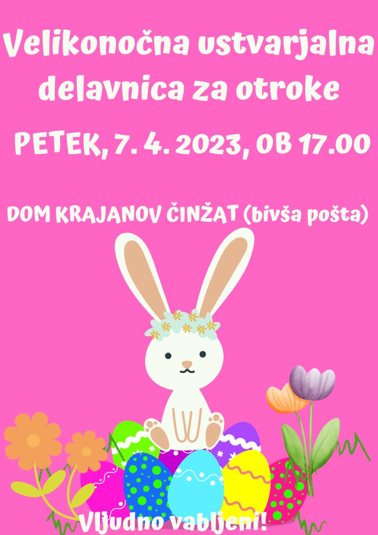V petek, 7. 4. 2023, ob 17.00 vabimo vse otroke, da se udeležijo "Velikonočne ustvarjalne delavnice", ki bo potekala v prostorih "Doma krajanov Činžat (bivša pošta)".