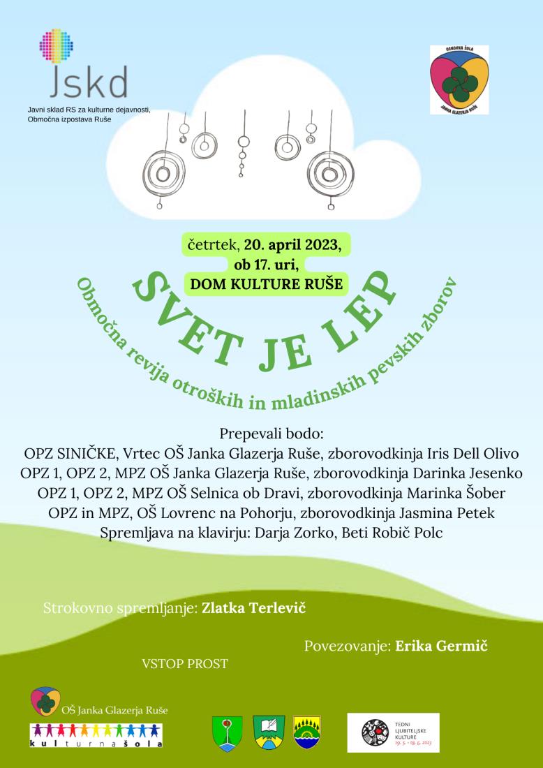 Vabljeni v Dom kulture Ruše na Revijo otroških in mladinskih pevskih zborov iz OŠ Lovrenc na Pohorju, OŠ Selnica ob Dravi, OŠ Janka Glazerja Ruše ter OPZ vrtca Ruše.