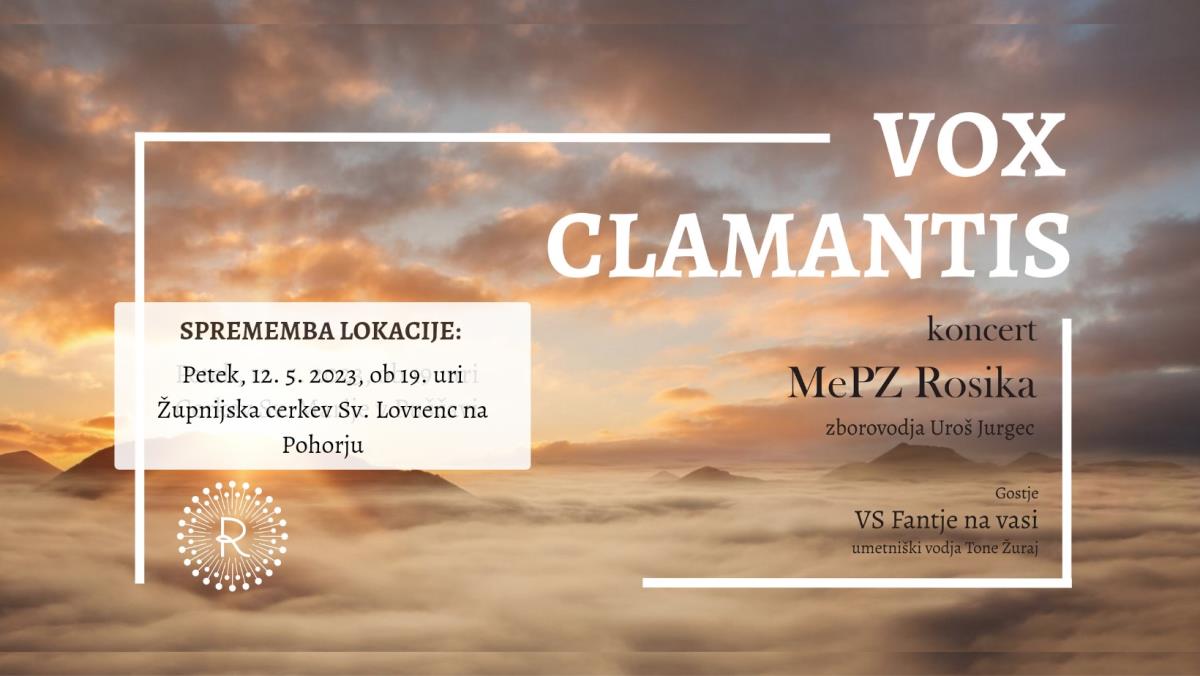 MePZ Rosika prisrčno vabimo na koncert z naslovom Vox clamantis. Pevski večer bo potekal v petek, 12. 5. 2023, ob 19. uri v Župnijski cerkvi Sv. Lovrenc na Pohorju.