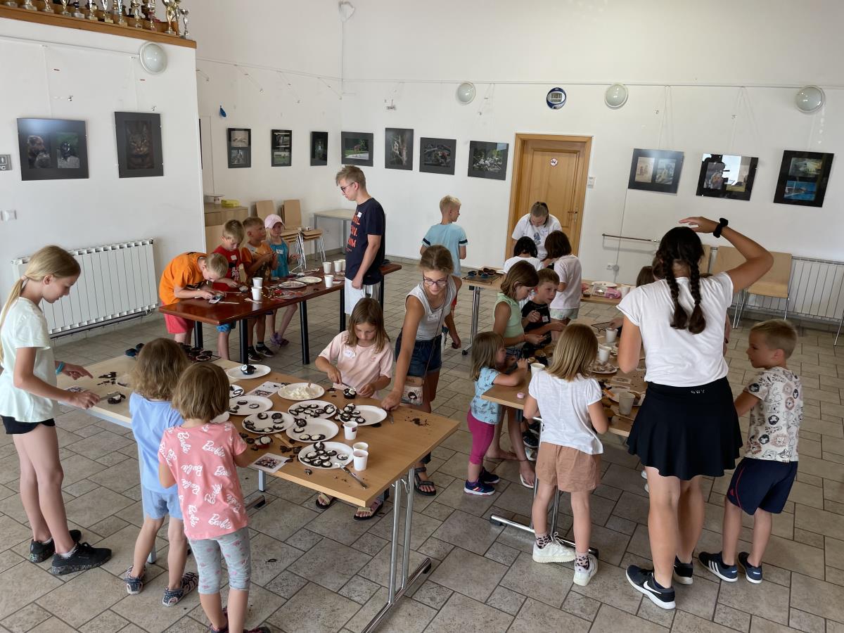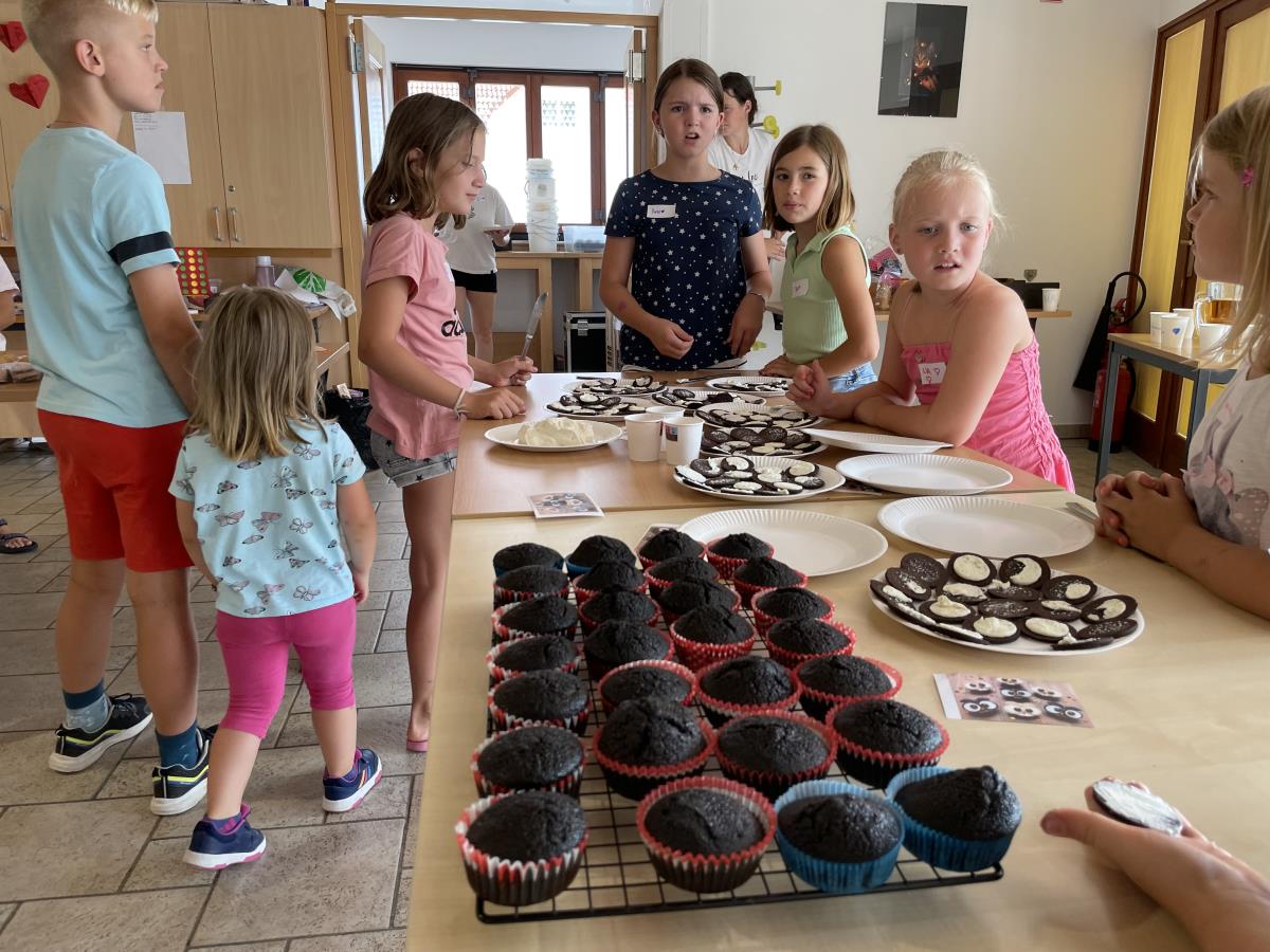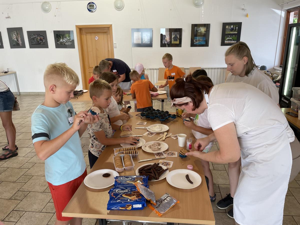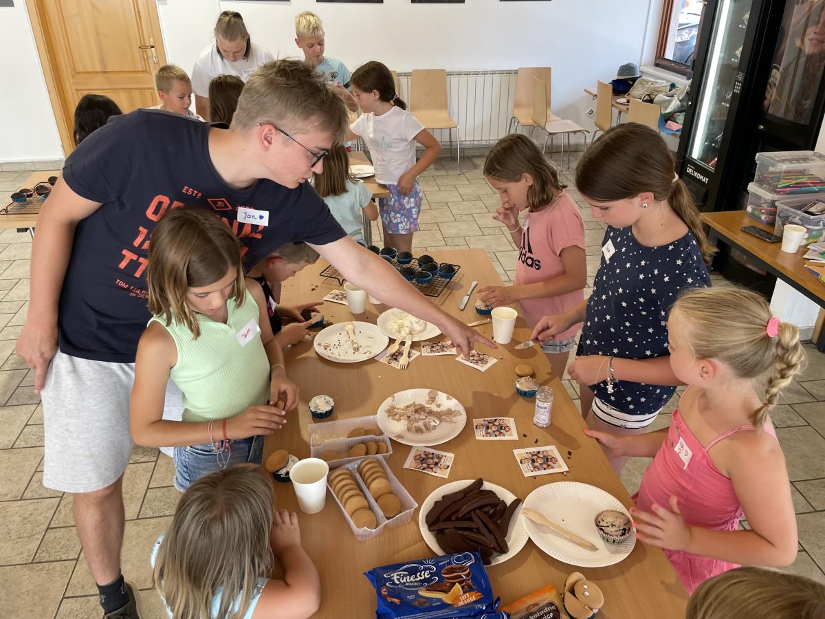 Nov teden, nov dan za aktivne počitnice...Začeli smo jih z igro in dobrim zajtrkom in jih nadaljevali z delavnico "Naša mala slaščičarna 2.0". Z nami je bila ponovno Špela Španbauer iz pekarne Saint Lorenz, ki je za nas pripravila slastne mafine. Otroci so si izdelali podstavke s svojim imenom in iz mafinov izdelali različne motive. Od pujska, sovice, ribice in niti navihana opica ni manjkala. Nekaj izdelkov smo pojedli, nekaj smo jih hranili v hladilnik za domov. Po delavnici smo odšli na kosilo in se po kosilu na igrišču igrali igro "Kdo se boji črnega moža?".