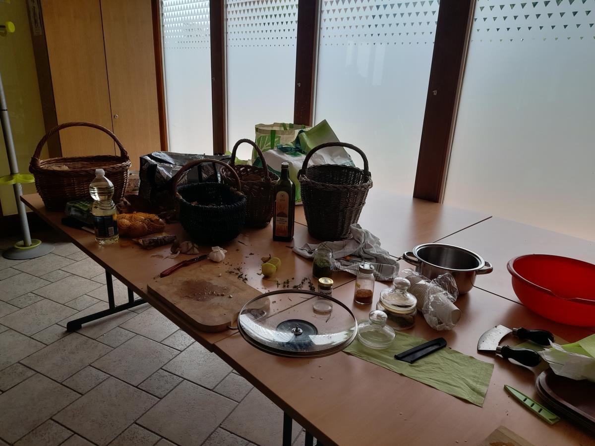 G. Jernej ni le mojster gobarjenja, je tudi izvrsten kuhar. Po nabiranju in čiščenju gob (vsi smo bili opremljeni s pletenimi košarami in nekateri tudi z gobarskimi nožki, ki imajo na eni strani tudi čopič), smo se vrnili v Prireditveni center. Mastili smo se z gobji karpačem (surove gobe), gobjim namazom, gobovo juho, različnimi mešanicami praženih gob, ki smo jim dodali zelišča, ki smo jih spoznali že v soboto in nabrali z gobami vred. Vrhunski so bili okusi in mislim, da bom poskusila ponovno kaj pripraviti tudi doma (karpačo sem že uspešno preizkusila). Pogovarjali smo se tudi o gobjih shrankih in njihovi uporabi. Ob zeliščni pijači smo se tudi Jerneju zahvalili s skromnim darilcem in dogovorom, da delavnico v jesenskem času ponovimo.