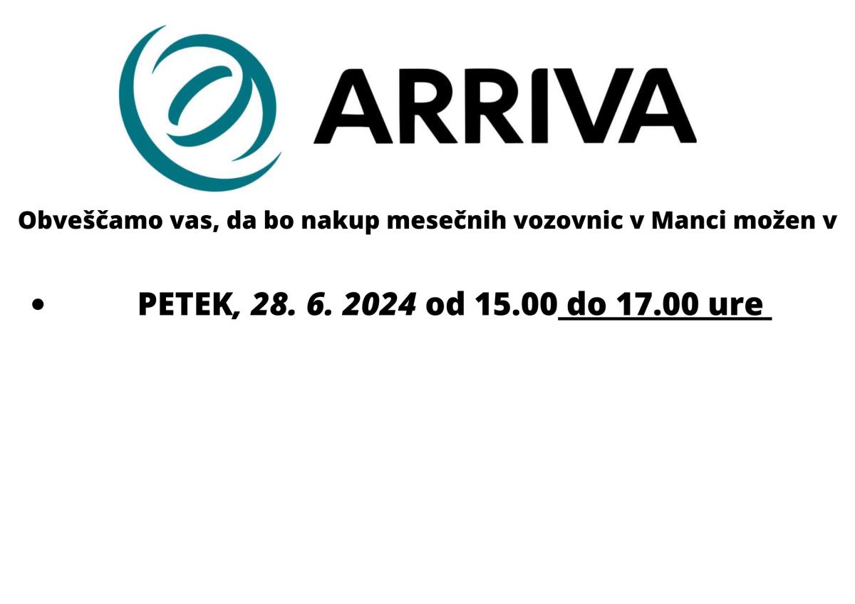 Obveščamo vas, da bo nakup mesečnih vozovnic v Manci možen v PETEK, 28. 6. 2024 od 15.00 do 17.00 ure.