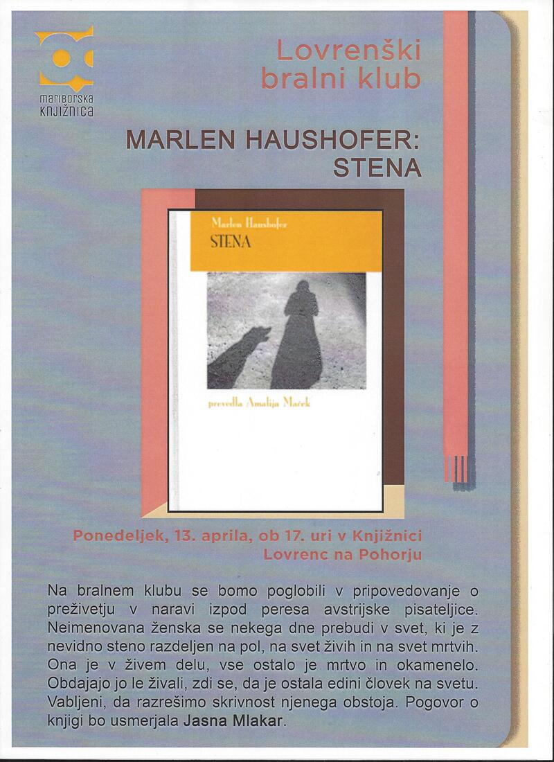 Na bralnem klubu se bomo poglobili v pripovedovanje o preživetju v naravi izpod peresa avstrijske pisateljice. Neimenovana ženska se nekega dne prebudi v svet, ki je z nevidno steno razdeljen na pol, na svet živih in na svet mrtvih. Ona je v živem delu, vse ostalo je mrtvo in okamenelo. Obdajajo jo le živali, zdi se, da je ostala edini človek na svetu. Vabljeni, da razrešimo skrivnost njenega obstoja.