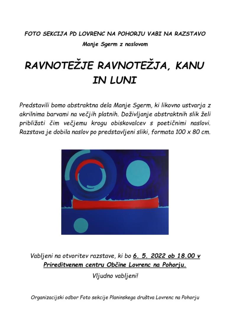 Fotosekcija Planinskega društva Lovrenc na Pohorju vabi na otvoritev druge letošnje razstave. Predstavili bodo abstraktna dela Manje Sgerm, ki likovno ustvarja z akrilnimi barvami na večjih platnih in želi doživljanje abstraktnih motivov približati širšemu krogu obiskovalcev s poetičnimi naslovi.