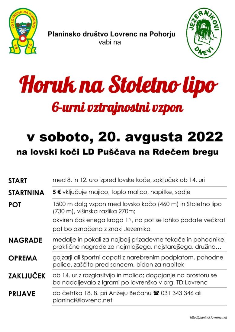 V soboto, 20. avgusta, vabimo na vztrajnostni vzpon z lovske koče na Stoletno lipo in nazaj. Na pot se lahko podate enkrat ali večkrat, za en krog boste potrebovali okoli ene ure. Ob zaključku bo malica s podelitvijo medalj in nagrad.