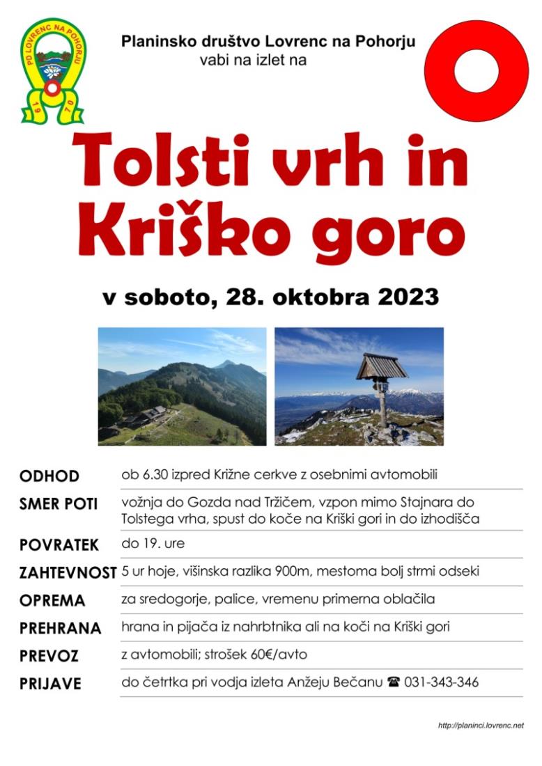 Planinsko društvo Lovrenc vabi v soboto, 28. oktobra, na Tolsti vrh v Karavankah. Gora je sosednji in malo nižji vrh od Storžiča ter tako lažje dostopen. Z njega so lepi razgledi na vse strani - od Kamniški, Julijcev, Karvank do planin v Avstriji in poglede v dolino.